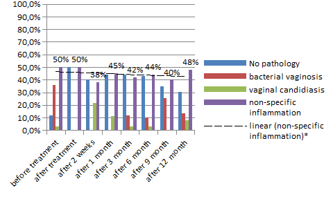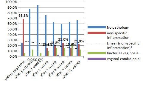 According to the data colposcopy, at the beginning of the study 13 patients revealed the signs of inflammation and 19 women had a favorable colposcopic picture.