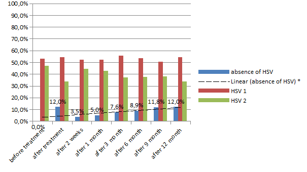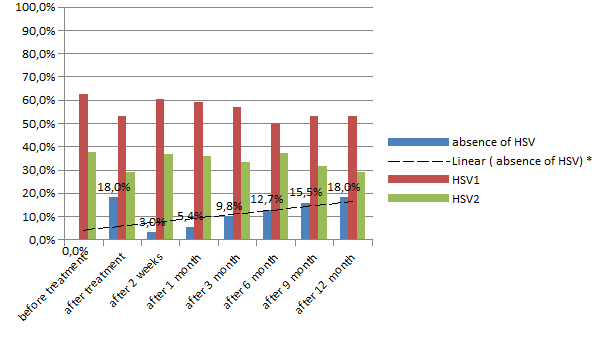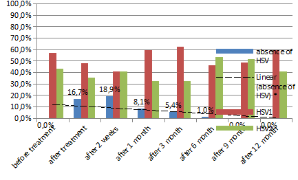 In all three groups there was a similar picture of patients infected with HSV-1 or HSV-2 before treatment.