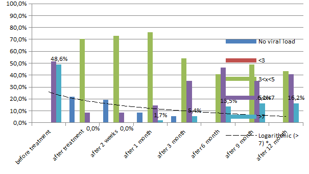 Viral load in the comparison group (Valtrex), (see Fig. 5) is reduced during the first month of treatment, due to the rapid virucidal and virustatic action of Valtrex. Also, it obligates increases throughout the remainder of the observation period, as Valtrex has no cumulative effect and pharmacologically stimulating effect on the immune system. Increased viral load, according to PCR, explains the decrease of the immune competence of HSV-infected persons or activation of latent persistent virus under the influence of adverse external influences on the body.